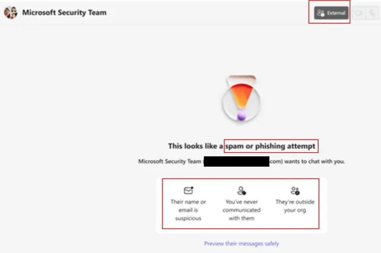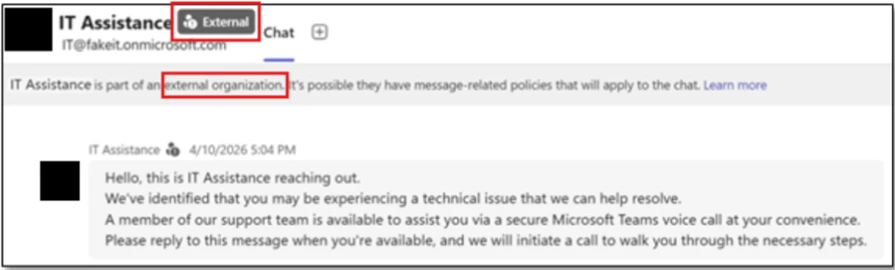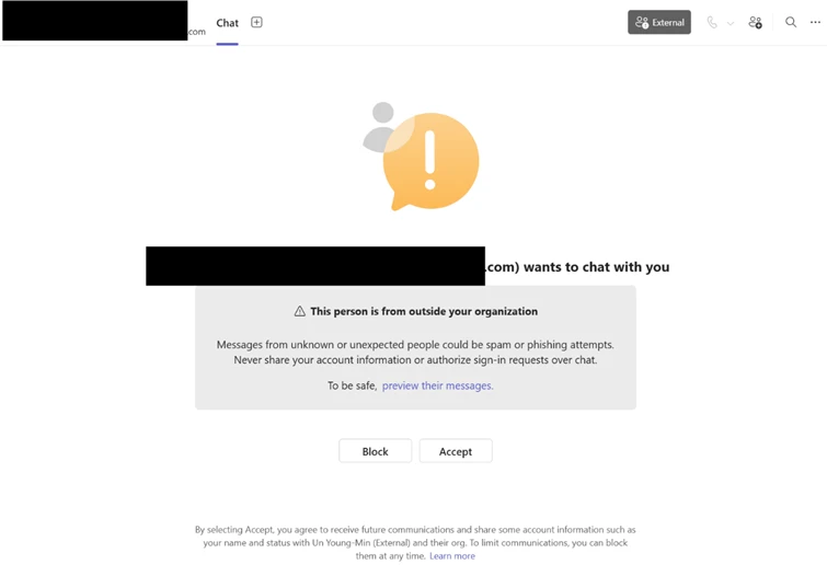 By abusing enterprise collaboration workflows instead of traditional email‑based phishing channels, attackers may initiate contact through applications such as Microsoft Teams in a way that appears consistent with routine IT support interactions. While Teams includes built‑in security features such as external‑sender labeling and Accept/Block prompts, this attack chain relies on convincing users to bypass those warnings and voluntarily grant remote access through legitimate support tools.