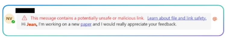 Safe Links for time-of-click protection warns users when URLs from Teams chat messages are malicious: