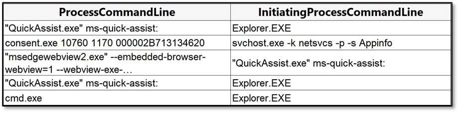 With user consent obtained through social engineering, the attacker gains interactive control of the device using remote support tools such as Quick Assist. This access typically results in the launch of QuickAssist.exe, followed by the display of standard Windows elevation prompts through Consent.exe as the attacker is guided through approval steps.