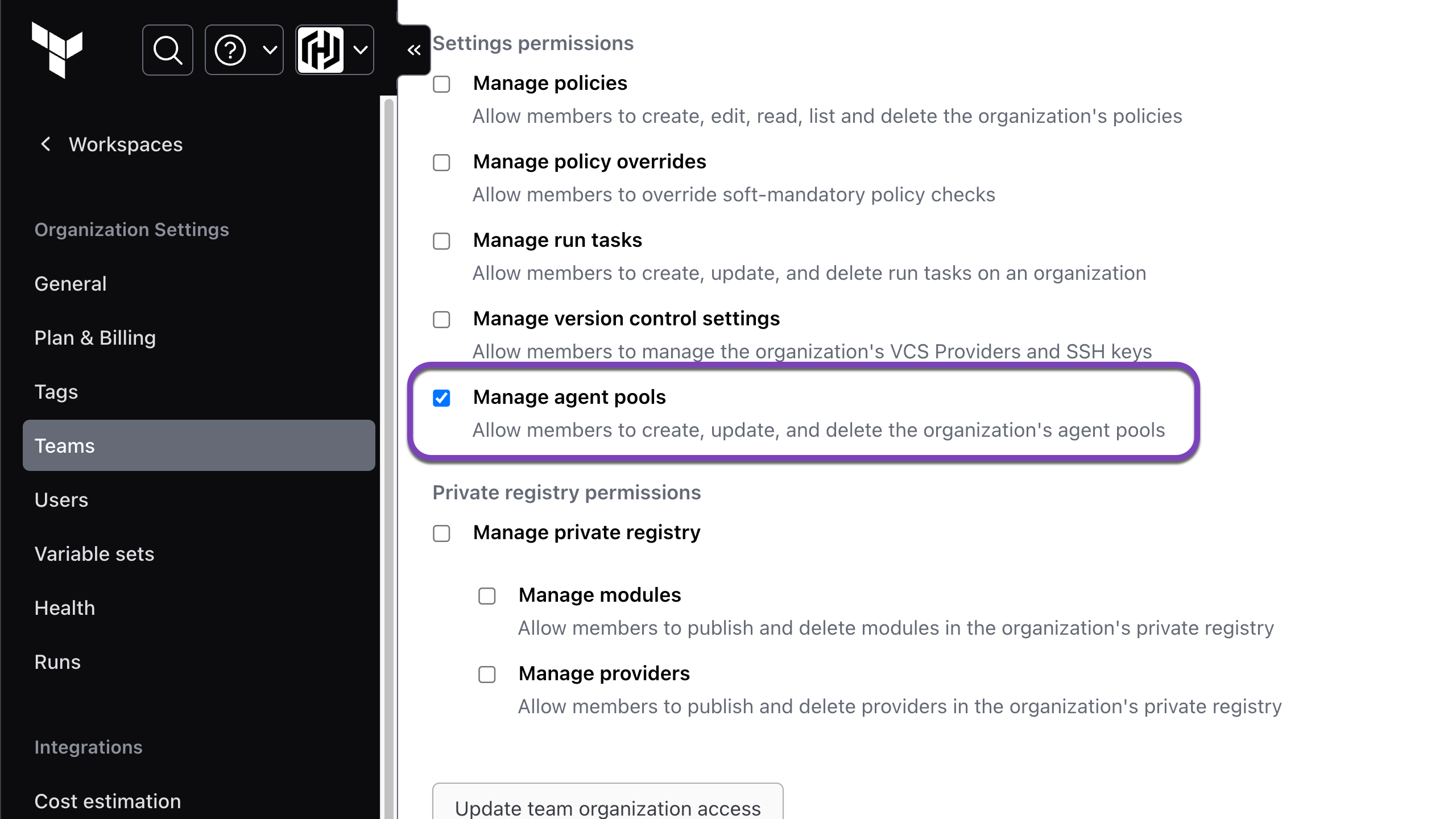 Previously in HCP Terraform and Terraform Enterprise, managing agent pools could be cumbersome for organization owners, since this functionality was restricted to the owner permission level. Owners needed to review and approve frequent permission requests or elevate other users to the organizational owner team, granting full platform access to users who potentially should not hold such permissions, which could introduce security risks.