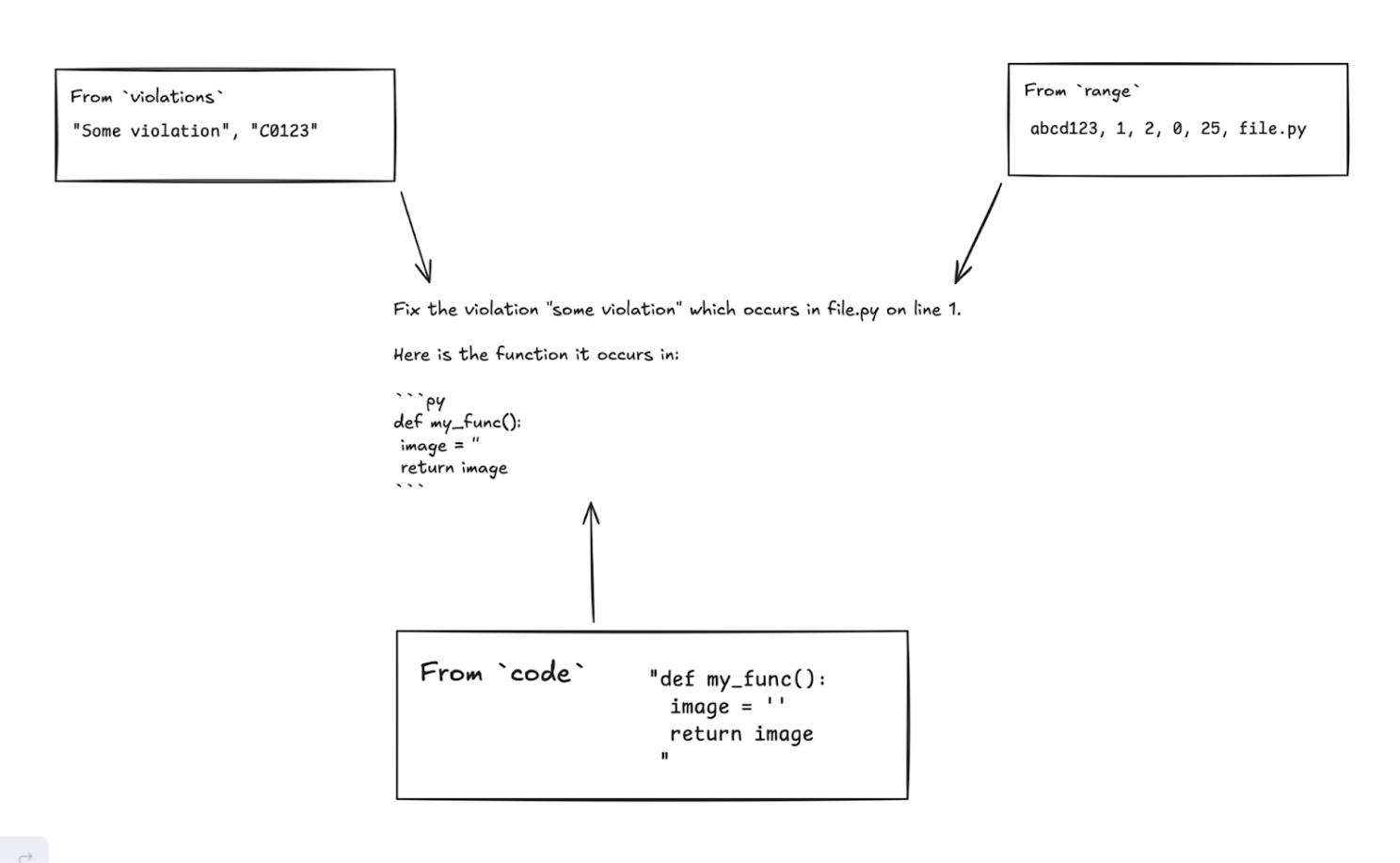 From this Pylint violation, we know that the variable foo is a disallowed name. However, if we tried to ask the LLM to fix this issue based solely on this snippet of information, the response wouldn’t be as effective. Why? The LLM lacks the surrounding context — the full picture of the function in which this violation occurs.