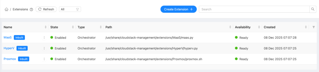 The built-in MAAS extension is visible directly in the CloudStack UI under the Extensions section, as shown below.